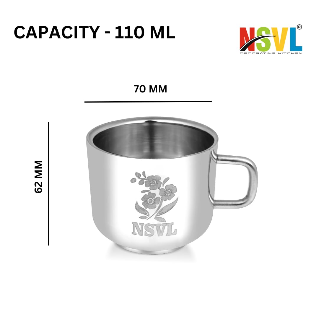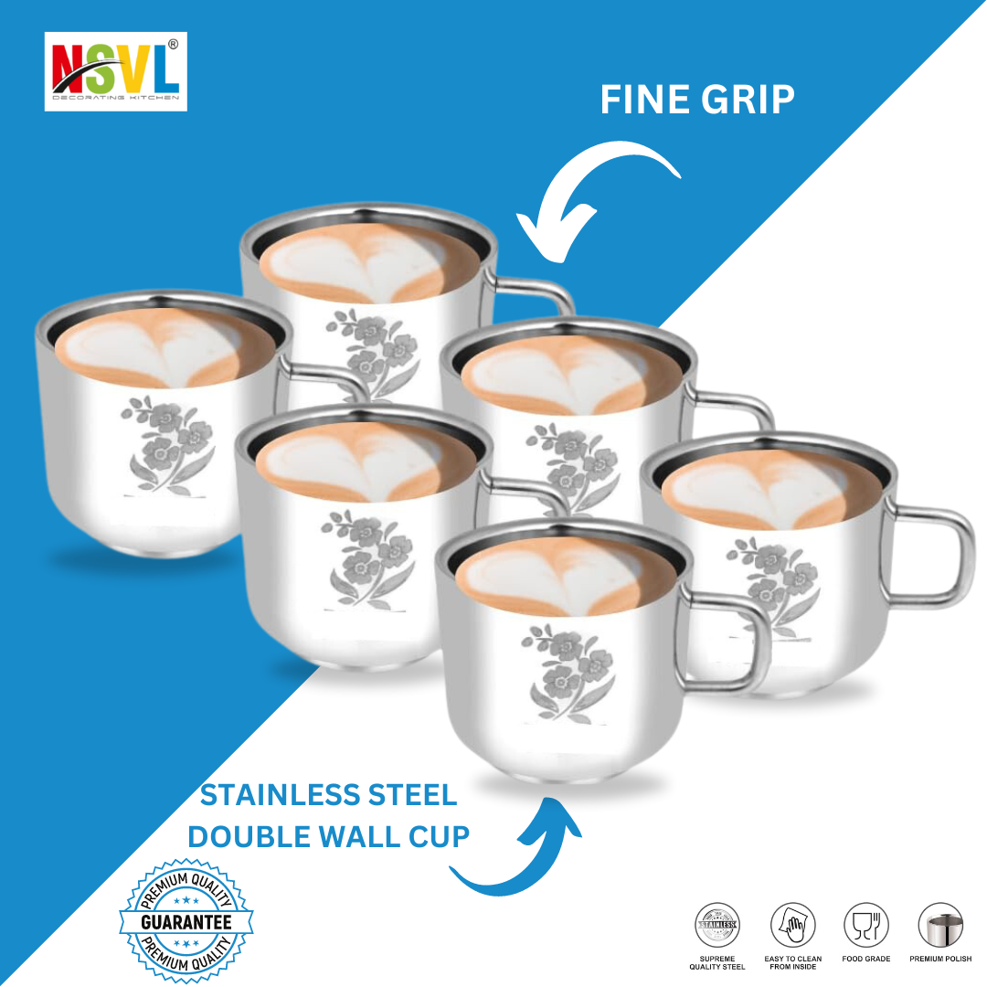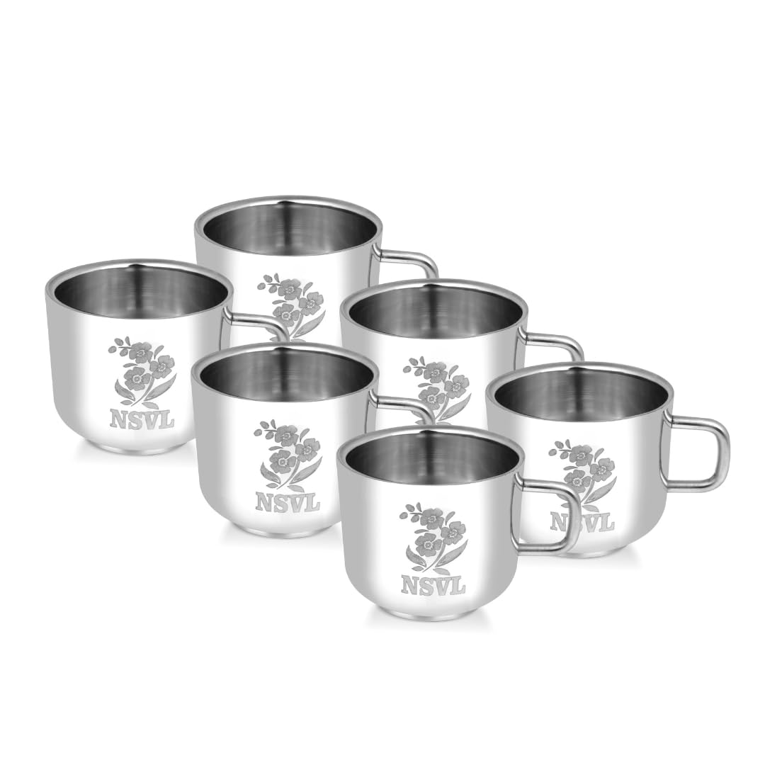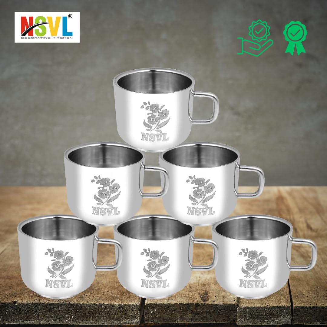 Nsvl 100% Stainless Steel Tea Cups Set of 6 Pcs | Double Wall Tea & Coffee Cups | Mirror Finish Cups | Laser Design, Break Resistant