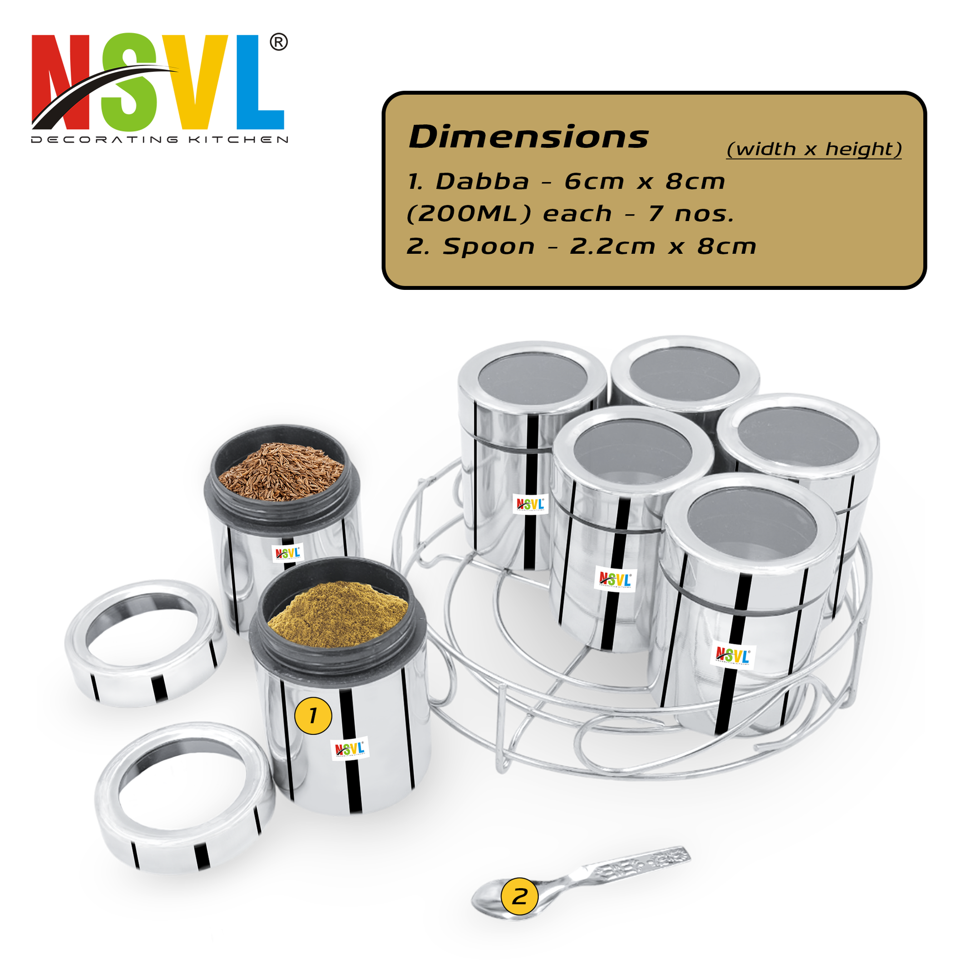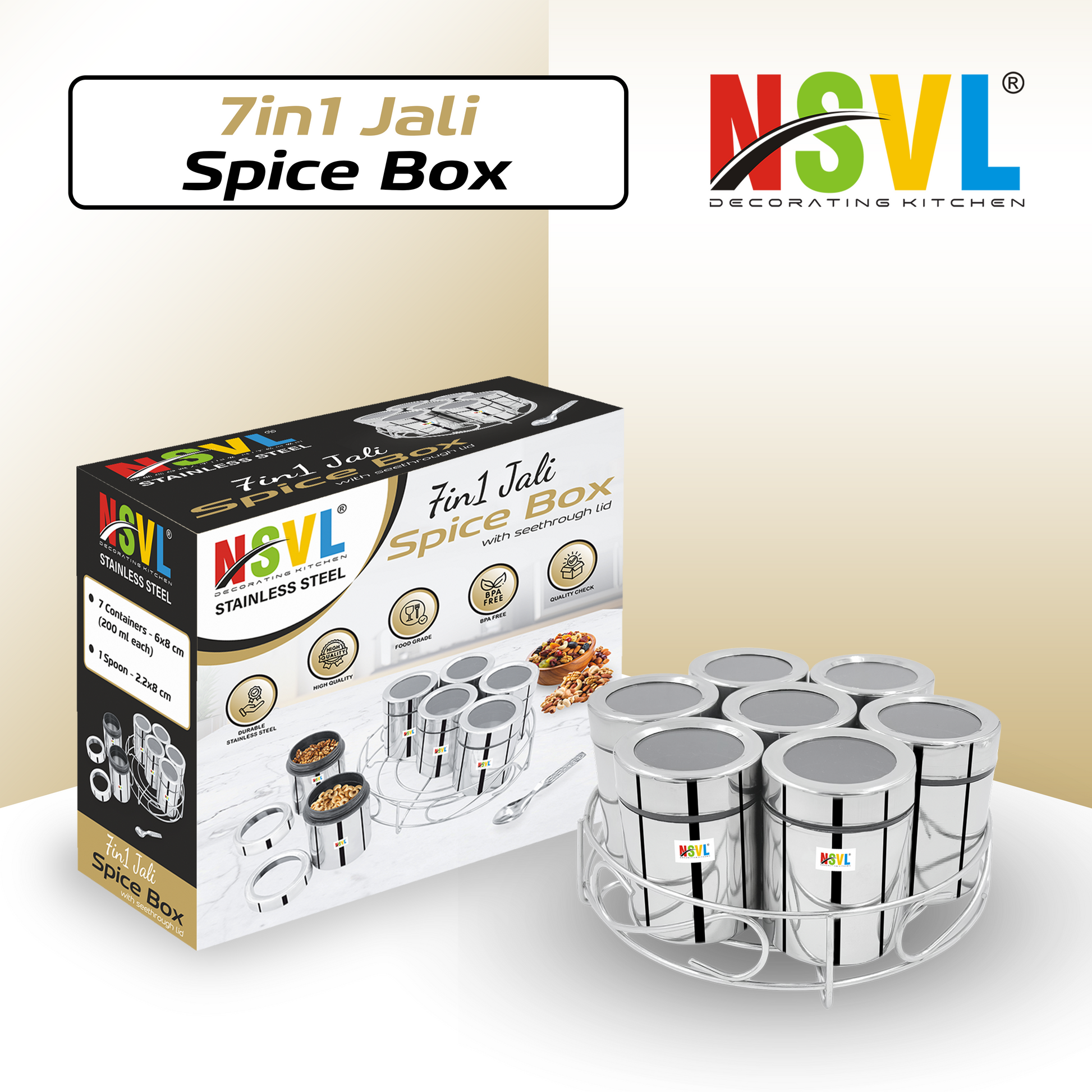 NSVL 7 in1 masala box / dabba with see-through lid are a must in every kitchen. Other than spices, it can be used for your favorite herbs and ingredients that you personally like to use in your daily cooking. The masala box is an aesthetically designed kitchenware to store all your essential cooking spices. Its unique shape adds to its looks and see through lid adds to its convenience. It consists of nine see through separate removable stainless steel cups and 3 small utility spoon for convenient handling and ease of use. Herbs and spices are the essential ingredients that add flavor, life, and personality to every dish you cook. In order to make the most of your spices, they must be fresh. Spices don’t necessarily “go bad”, but they do lose freshness over time. Air, heat, and moisture are the factors that affect the freshness of spices. Keeping moisture out of your spices is particularly important. * Rust Proof and Hygienic This nsvl 7 in 1 masala box / dabba is rust proof and hygienic. Made from food grade stainless steel making it highly durable and resistant to corrosion. Removable containers makes it Easy to clean and all are dishwasher safe. *Convenience to use It consists of nine separate removable stainless steel cups and 3 small utility spoon for convenient handling and ease of use. It is having transparent visibility so that you can easily identify the different types of Masalas. It just not added value to your kitchen but will add value to your food as well. *Air tight fitting with Mirror Finish This masala box comes with air tight fitting which help to prevent moisture in the items in the box. This Masala Box comes with elegant mirror finish which looks really beautiful in every kitchen.