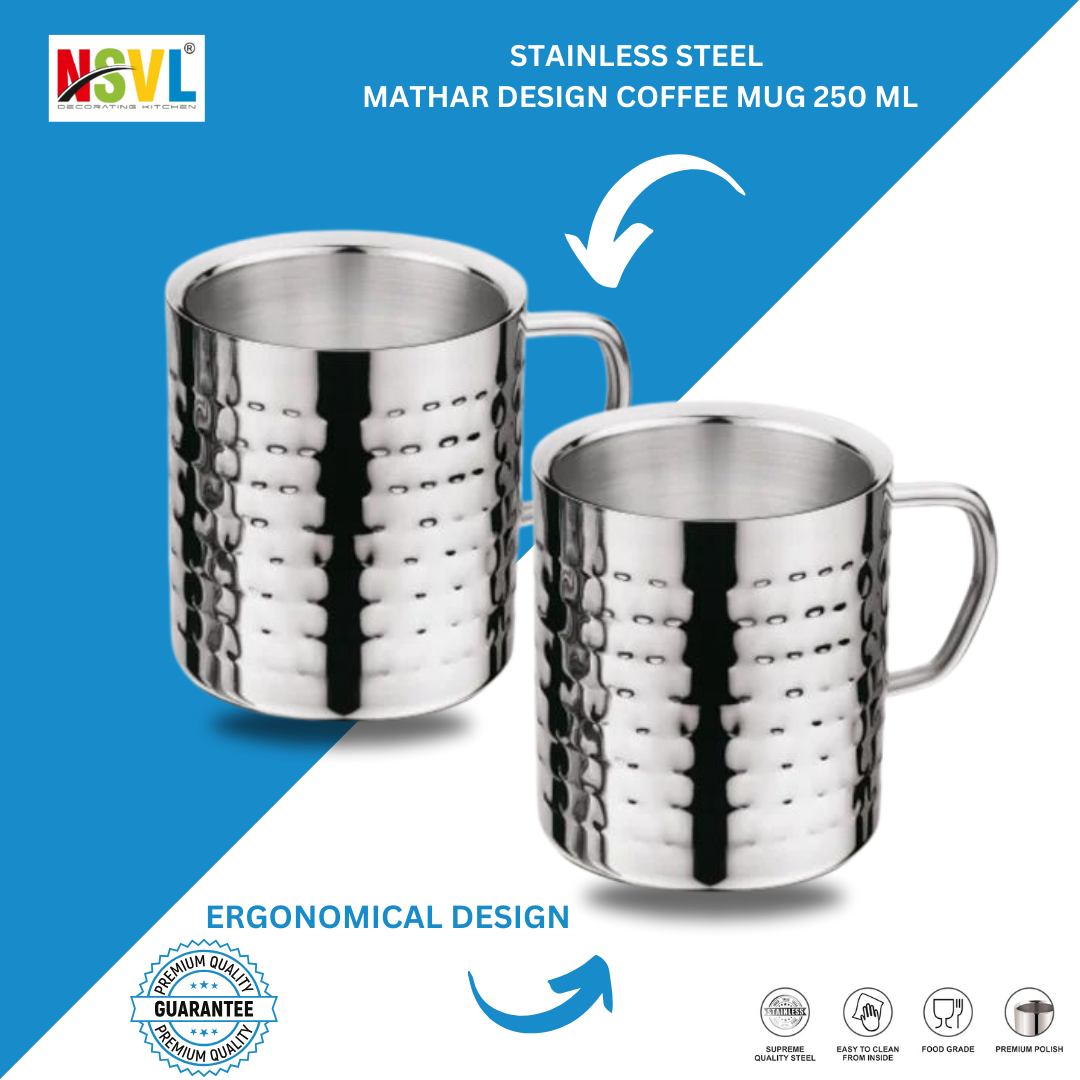 - Our stainless steel mug with a wider handle is sturdy and ensures a better grip. Dimension of Cups: Height: 8 cm, Width: 9 cm, and Capacity: 250 ml. Double-walled steel insulation keeps your delicious coffee or tea hot and your hand cool. Indulge in piping hot coffee as it should be. No sweat, no condensation. Also works great for your favorite icy cold , or cocktail.