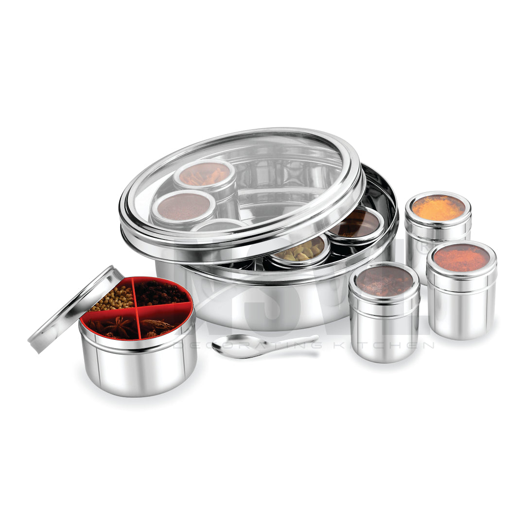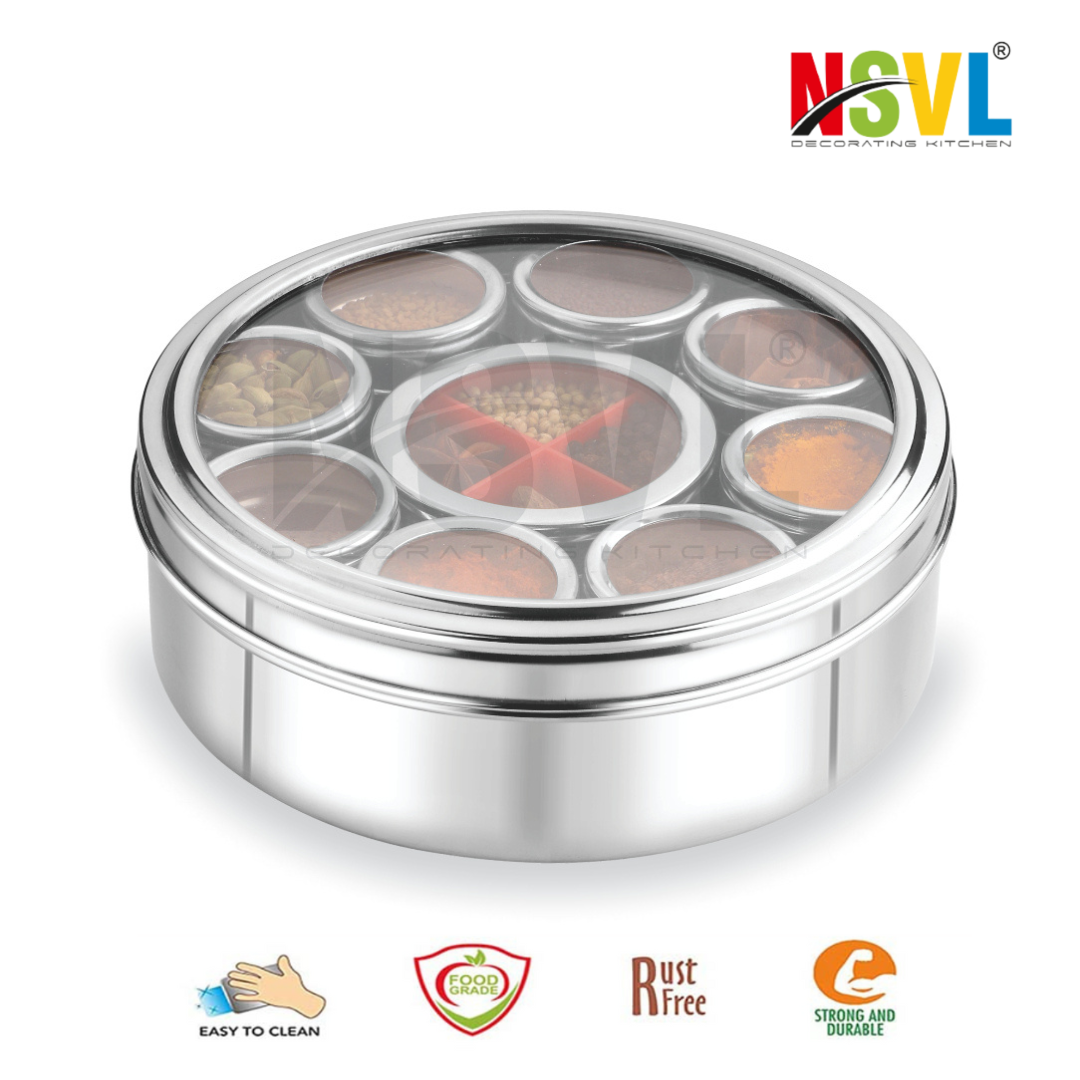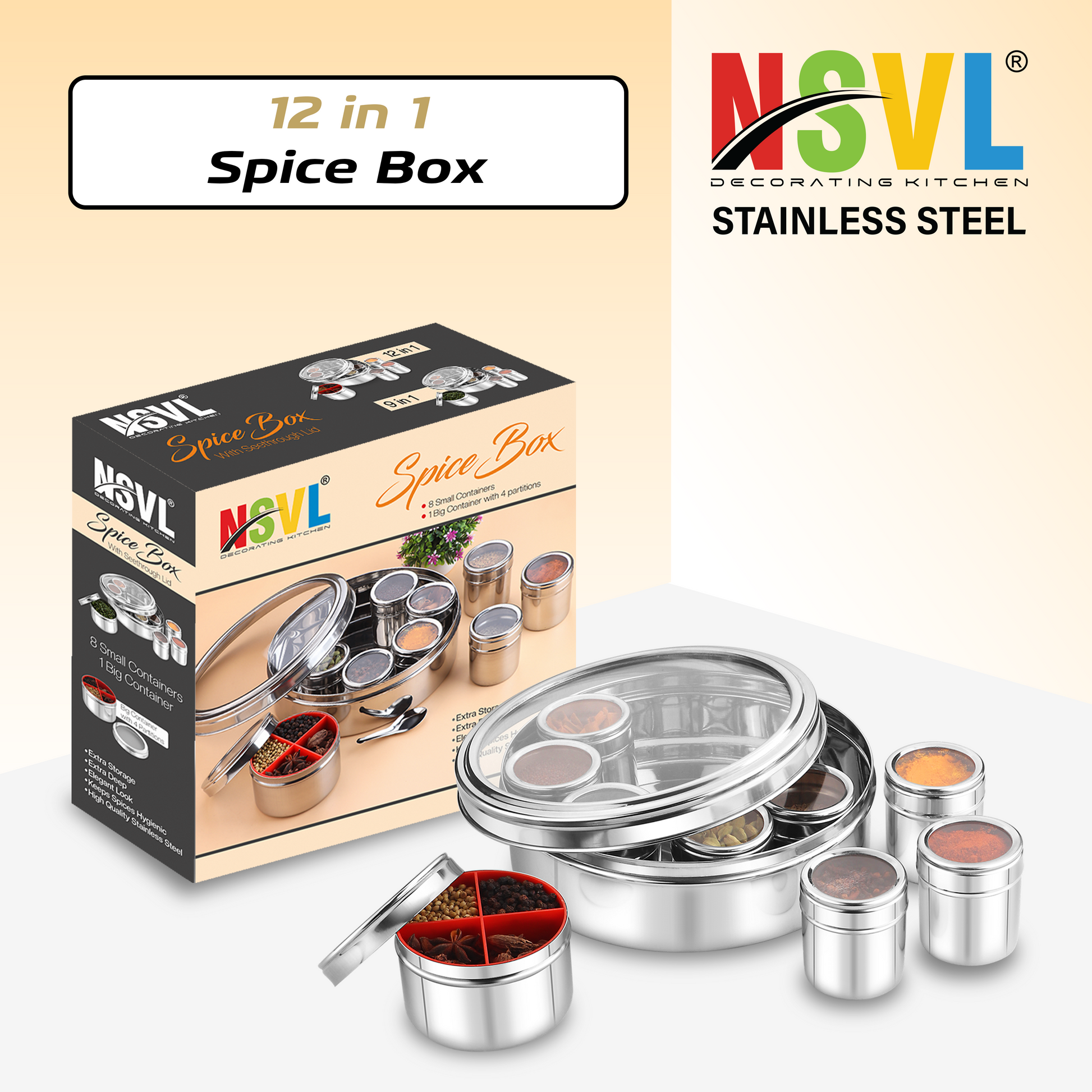 Nsvl Stainless Steel 12 IN 1 Masala Box for Kitchen | Masala Container | Spice Box for Kitchen | Masala Dabba/Masala Spice Box with See through lid 4 Spoons | Silver (2.5 Ltr / 22.5cm)