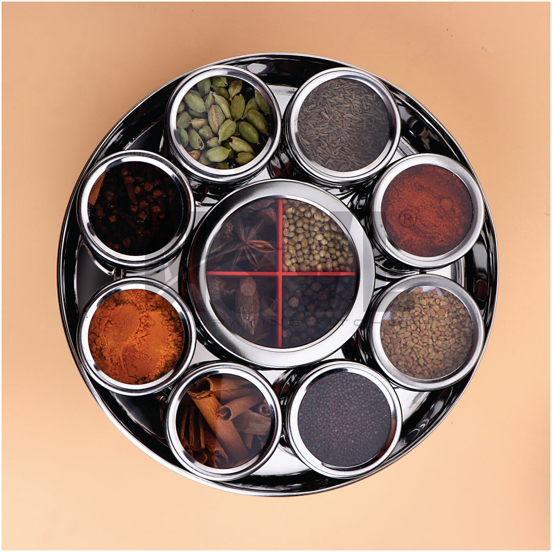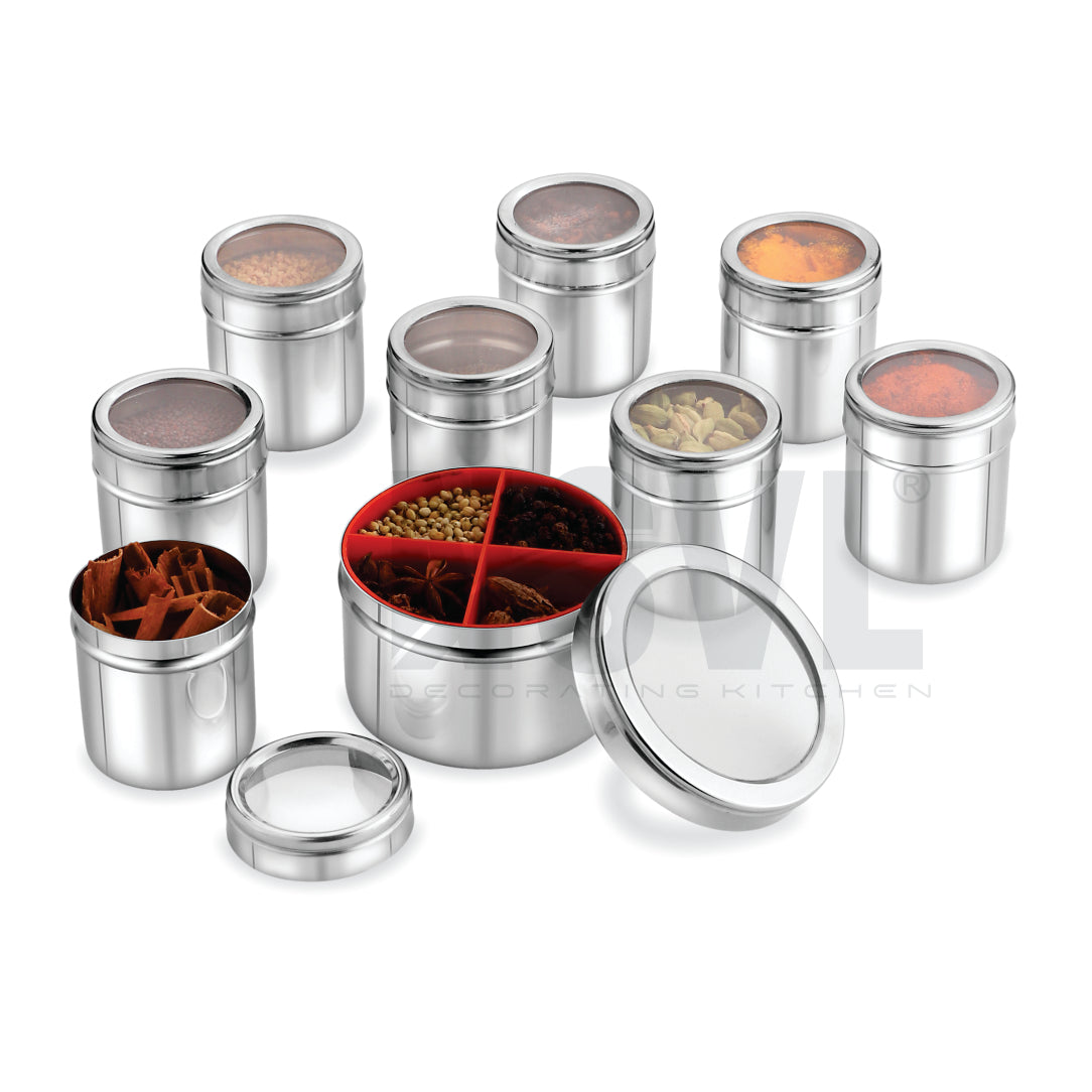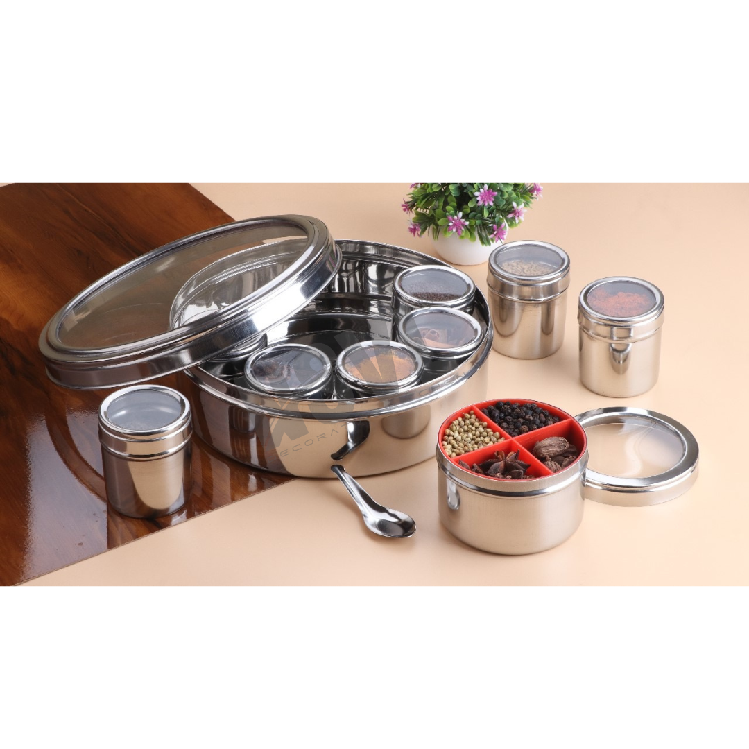 Nsvl Stainless Steel 12 IN 1 Masala Box for Kitchen | Masala Container | Spice Box for Kitchen | Masala Dabba/Masala Spice Box with See through lid 4 Spoons | Silver (2.5 Ltr / 22.5cm)