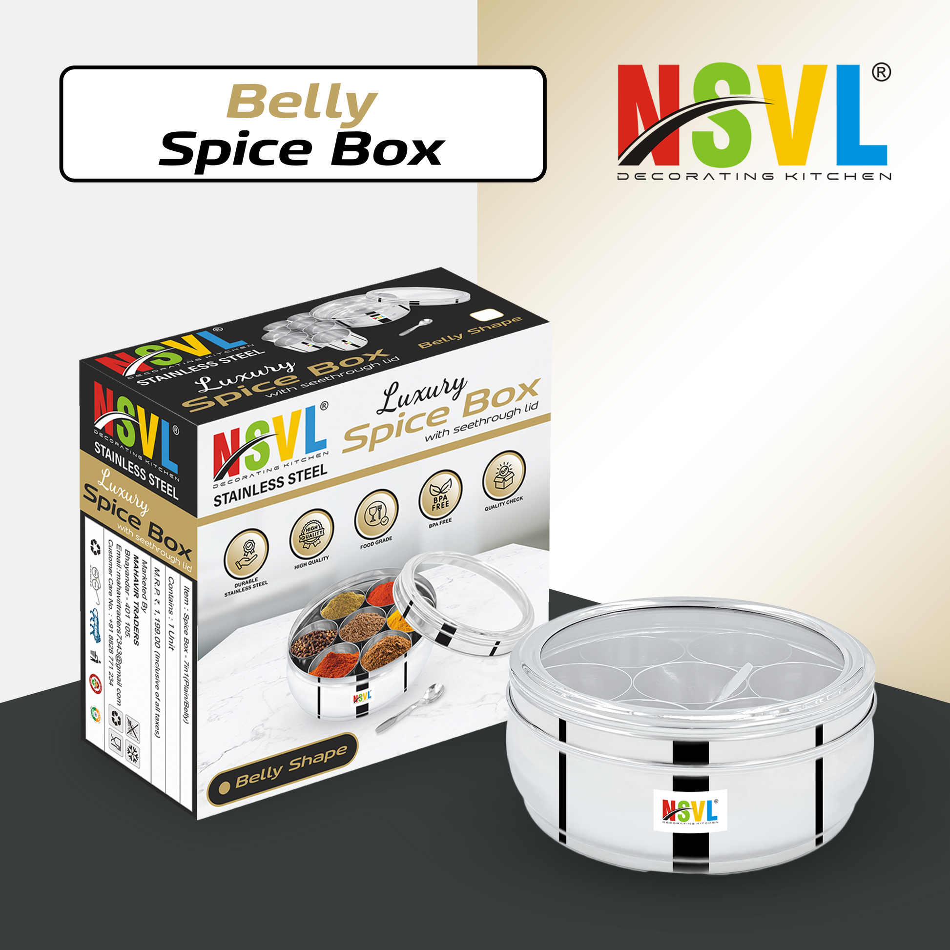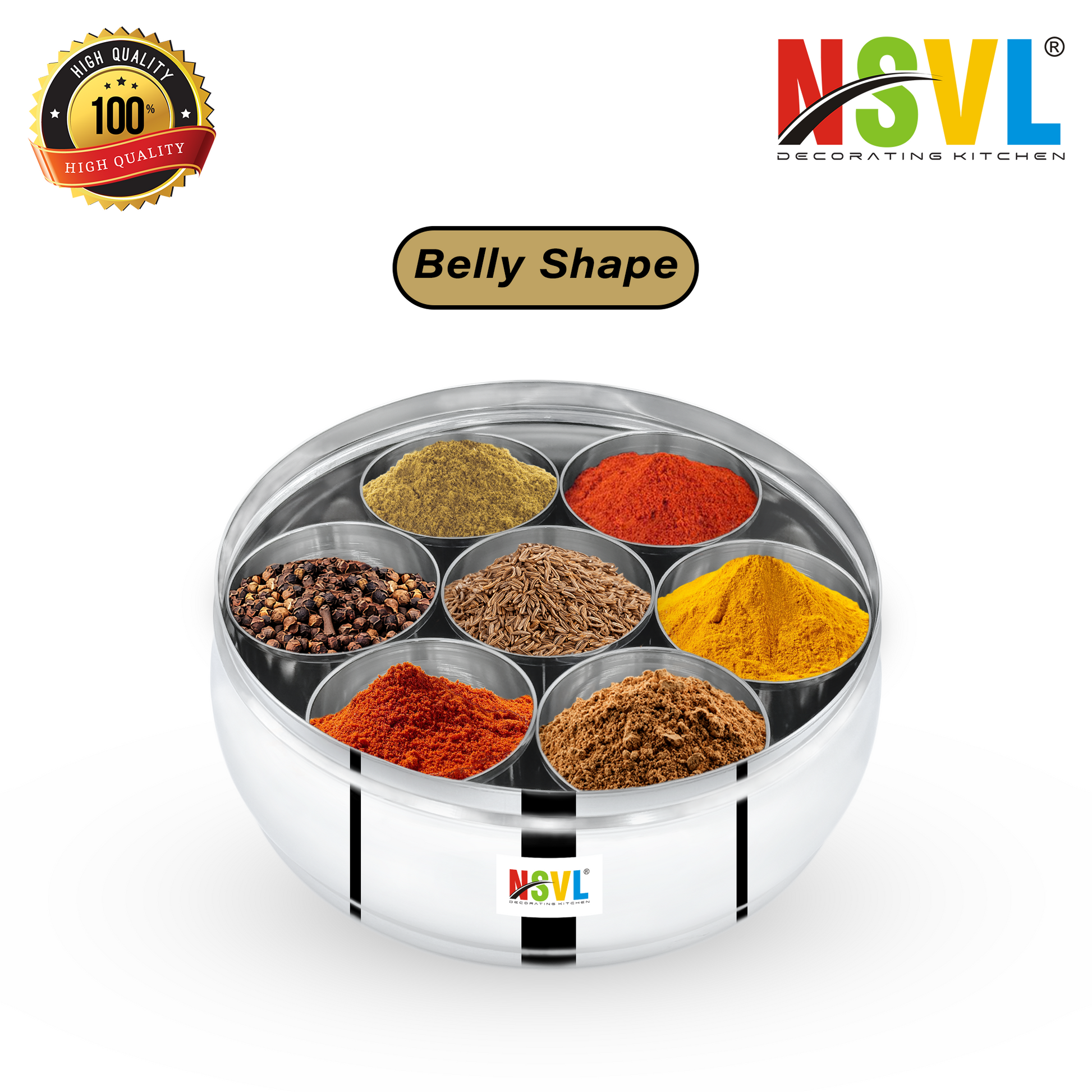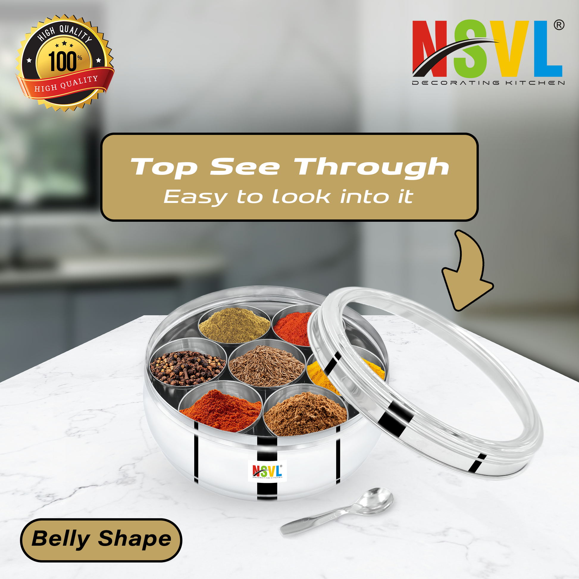 Nsvl Stainless Steel Belly Shape Masala box for Kitchen | Spice Box | Masala Dabba with See Through Lid with 7 Containers and Small Spoon | Silver (Medium 18cm | 1.5 Ltr) (BELLY)