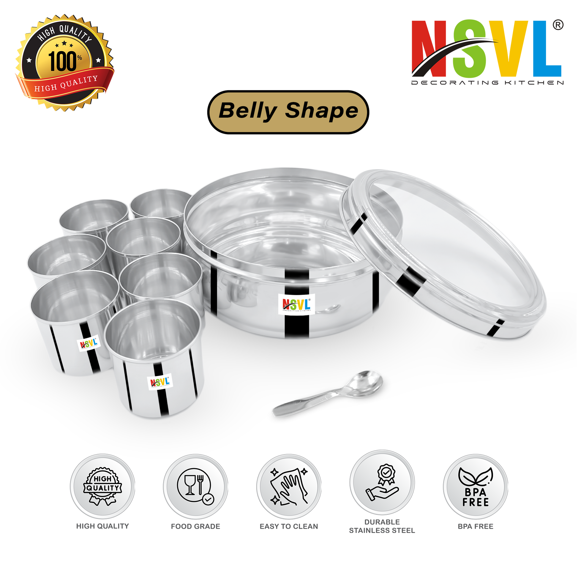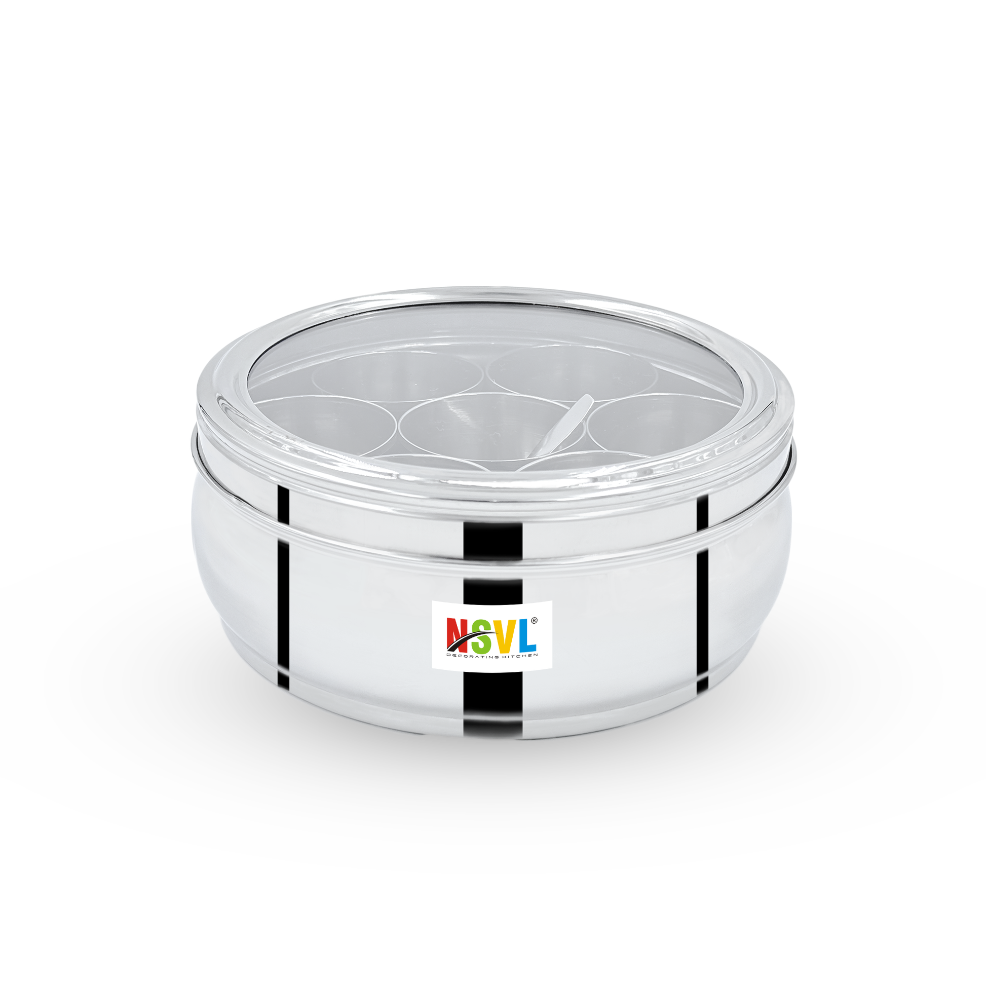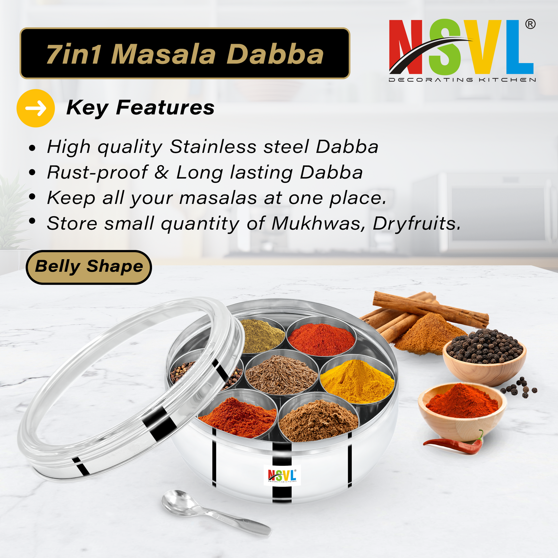 Nsvl Stainless Steel Belly Shape Masala box for Kitchen | Spice Box | Masala Dabba with See Through Lid with 7 Containers and Small Spoon | Silver (Medium 18cm | 1.5 Ltr) (BELLY)