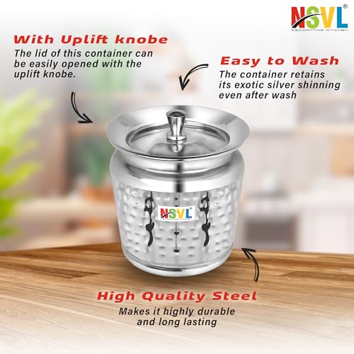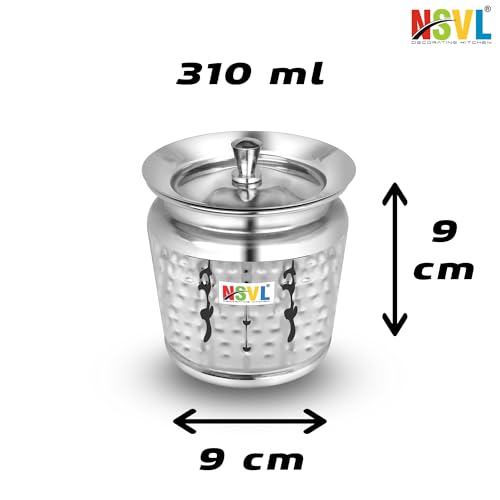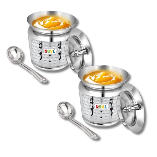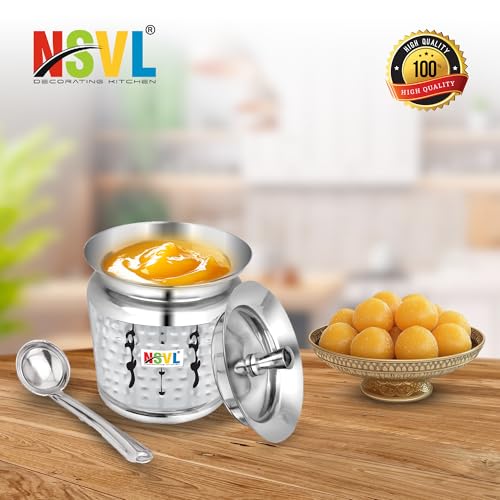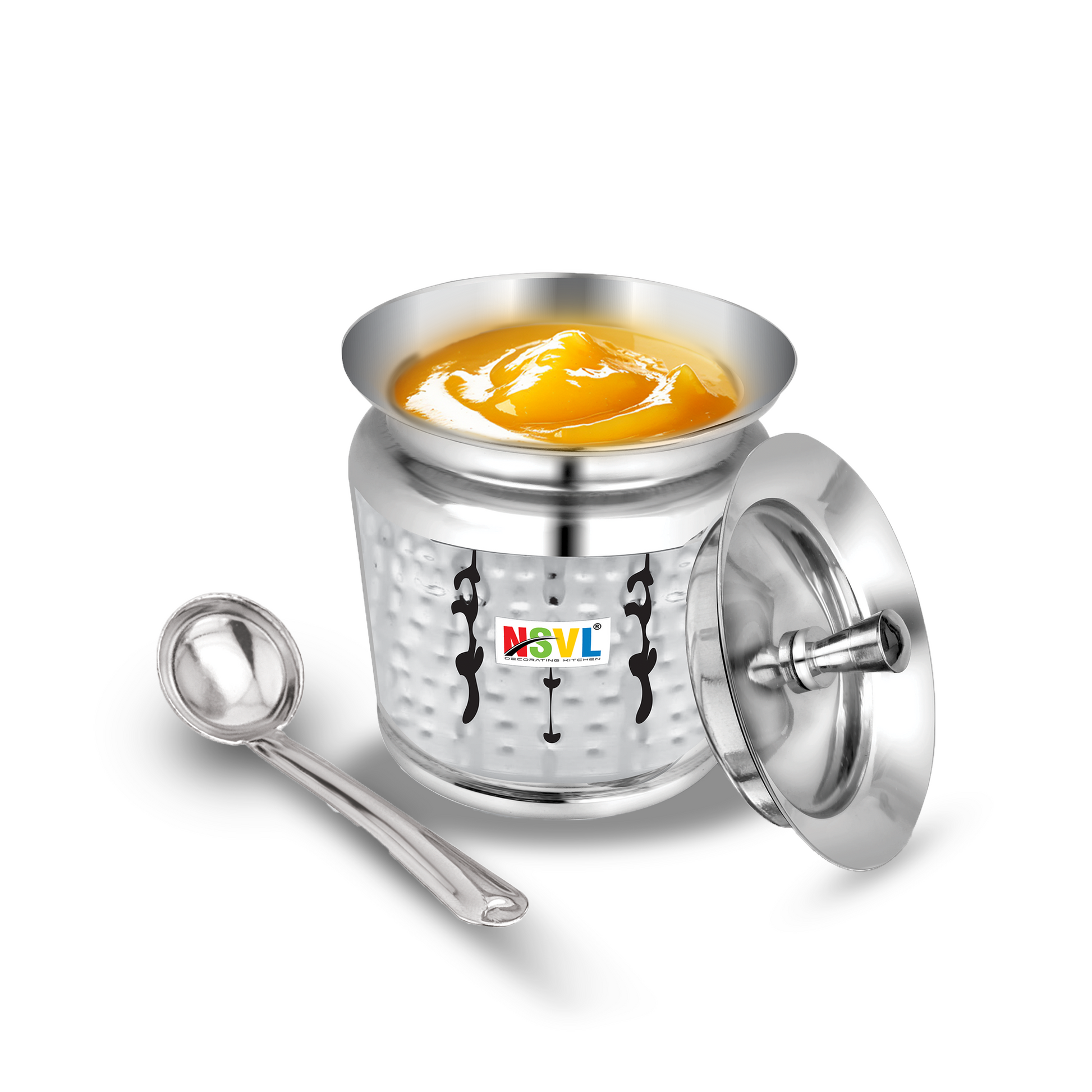 Nsvl Stainless Steel Multipurpose Ghee Pot/Pickle Container, 310 ml, With Spoon, (Hammered Design)