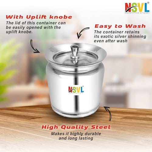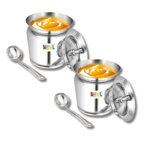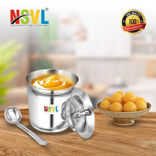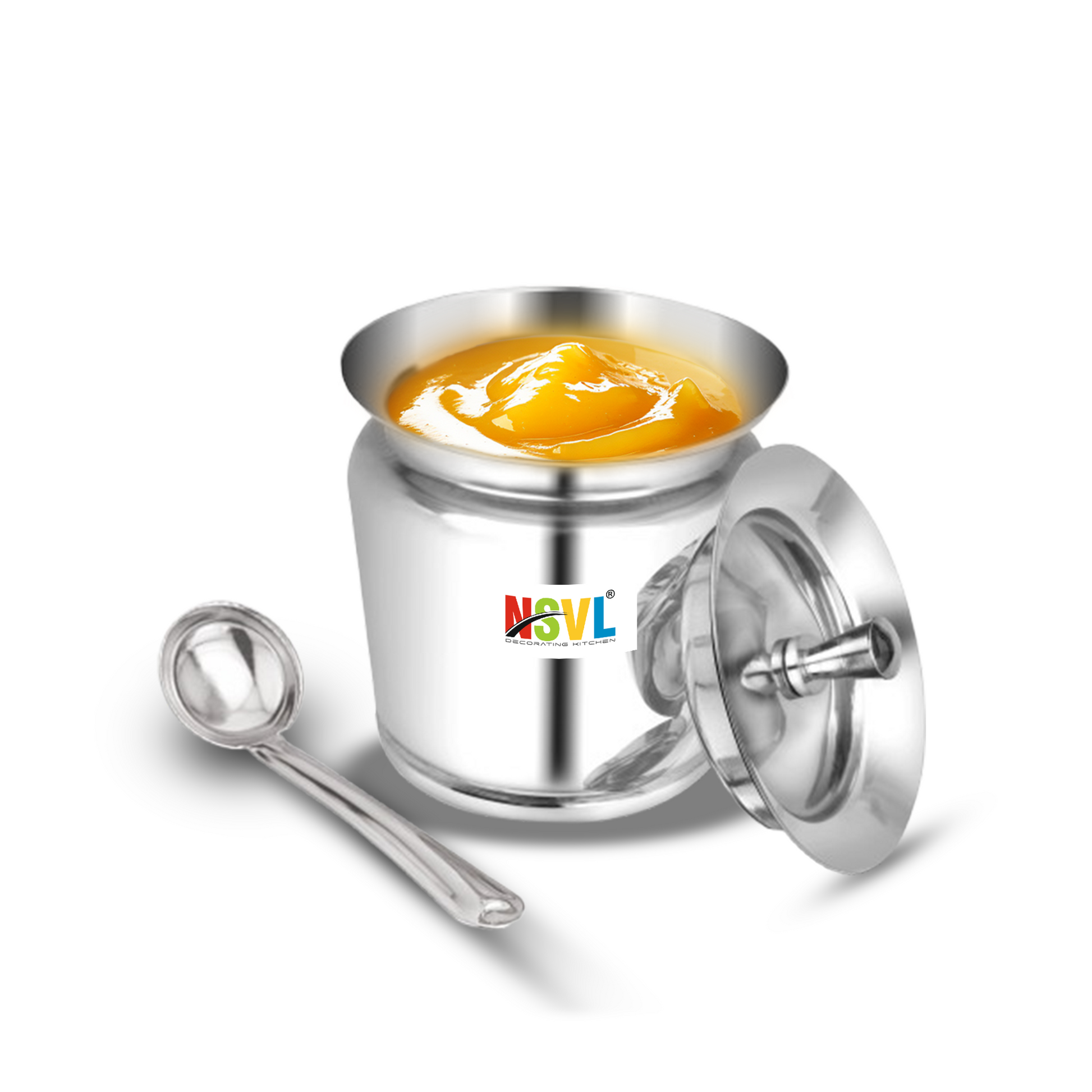 NSVL Stainless Steel Ghee Pot – Premium Storage for Pure Ghee Discover the perfect blend of elegance, durability, and functionality with the NSVL Stainless Steel Ghee Pot – designed to keep your ghee fresh, safe, and easily accessible. Whether you're an everyday cook or an Ayurvedic enthusiast, this ghee pot is a must-have for your kitchen. Premium Quality Stainless Steel Crafted from food-grade, rust-resistant stainless steel, this ghee pot ensures long-lasting durability and resistance to stains and odors. The high-quality material preserves the purity of your ghee, preventing contamination while maintaining its rich flavor and nutritional benefits. Airtight & Leak-Proof Design The NSVL Ghee Pot features a secure, airtight lid that keeps your ghee fresh for longer, protecting it from external contaminants and moisture. The leak-proof seal prevents any spills, making it easy to store and transport your ghee without worry. Easy-Pour Spout for Convenient Use Say goodbye to mess and waste! The built-in spout ensures smooth, controlled pouring, allowing you to use just the right amount of ghee with ease. No more spills or dripping – just precise pouring every time. Ergonomic Handle for Effortless Handling Designed with an ergonomic handle, this ghee pot offers a comfortable grip for easy lifting, pouring, and handling. Whether you're in the kitchen or serving ghee at the table, the handle provides added convenience and control. Elegant & Modern Design With its sleek and polished finish, the NSVL Stainless Steel Ghee Pot adds a touch of sophistication to your kitchen. The minimalist design fits seamlessly with both traditional and contemporary kitchen aesthetics, making it an attractive and practical addition to your cookware. Perfect for Ghee, Oils, and More While ideal for storing ghee, this versatile pot can also be used to store other oils, honey, syrups, or even spices. Its multi-purpose functionality makes it a great all-rounder for kitchen storage. Ideal for Ayurvedic and Traditional Cooking For those who practice Ayurveda or traditional Indian cooking, the NSVL Stainless Steel Ghee Pot is an essential tool. It helps preserve the integrity of ghee, which is often considered sacred and is a vital component in many health-conscious and spiritual practices.