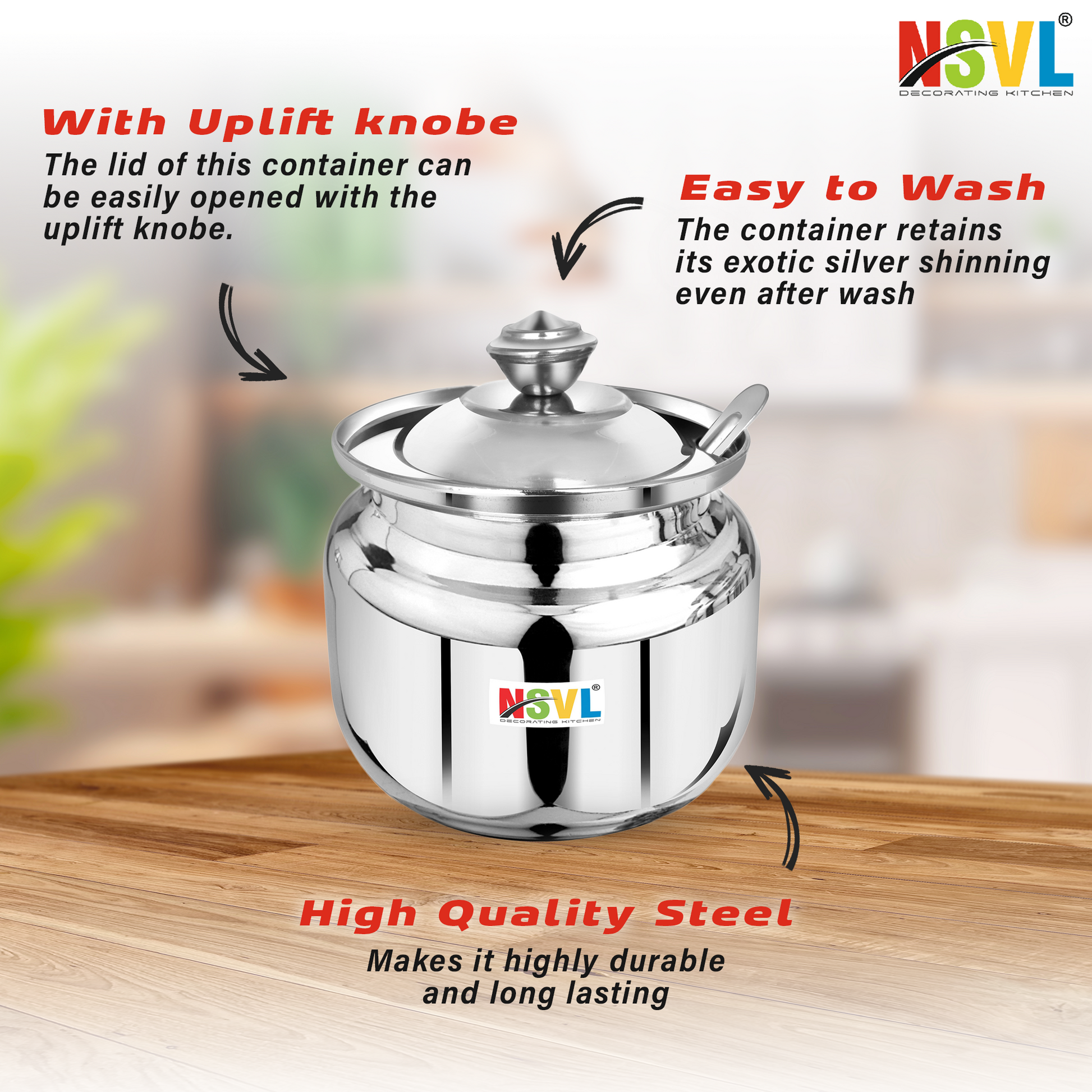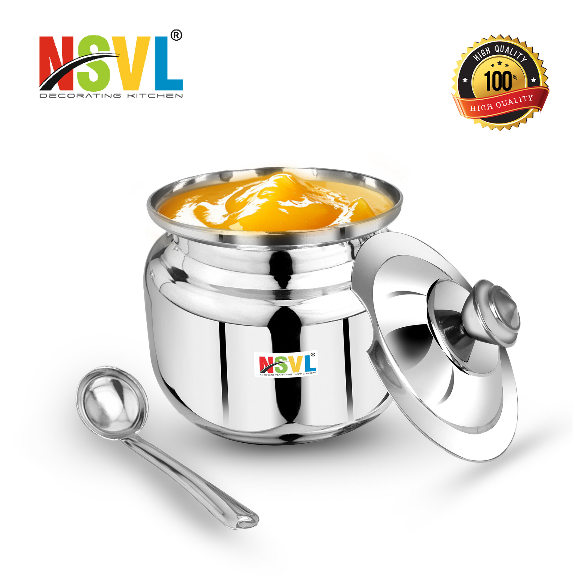 NSVL Stainless Steel Ghee Pot – Premium Storage for Pure Ghee Discover the perfect blend of elegance, durability, and functionality with the NSVL Stainless Steel Ghee Pot – designed to keep your ghee fresh, safe, and easily accessible. Whether you're an everyday cook or an Ayurvedic enthusiast, this ghee pot is a must-have for your kitchen. Premium Quality Stainless Steel Crafted from food-grade, rust-resistant stainless steel, this ghee pot ensures long-lasting durability and resistance to stains and odors. The high-quality material preserves the purity of your ghee, preventing contamination while maintaining its rich flavor and nutritional benefits. Airtight & Leak-Proof Design The NSVL Ghee Pot features a secure, airtight lid that keeps your ghee fresh for longer, protecting it from external contaminants and moisture. The leak-proof seal prevents any spills, making it easy to store and transport your ghee without worry. Easy-Pour Spout for Convenient Use Say goodbye to mess and waste! The built-in spout ensures smooth, controlled pouring, allowing you to use just the right amount of ghee with ease. No more spills or dripping – just precise pouring every time. Ergonomic Handle for Effortless Handling Designed with an ergonomic handle, this ghee pot offers a comfortable grip for easy lifting, pouring, and handling. Whether you're in the kitchen or serving ghee at the table, the handle provides added convenience and control. Elegant & Modern Design With its sleek and polished finish, the NSVL Stainless Steel Ghee Pot adds a touch of sophistication to your kitchen. The minimalist design fits seamlessly with both traditional and contemporary kitchen aesthetics, making it an attractive and practical addition to your cookware. Perfect for Ghee, Oils, and More While ideal for storing ghee, this versatile pot can also be used to store other oils, honey, syrups, or even spices. Its multi-purpose functionality makes it a great all-rounder for kitchen storage. Ideal for Ayurvedic and Traditional Cooking For those who practice Ayurveda or traditional Indian cooking, the NSVL Stainless Steel Ghee Pot is an essential tool. It helps preserve the integrity of ghee, which is often considered sacred and is a vital component in many health-conscious and spiritual practices.