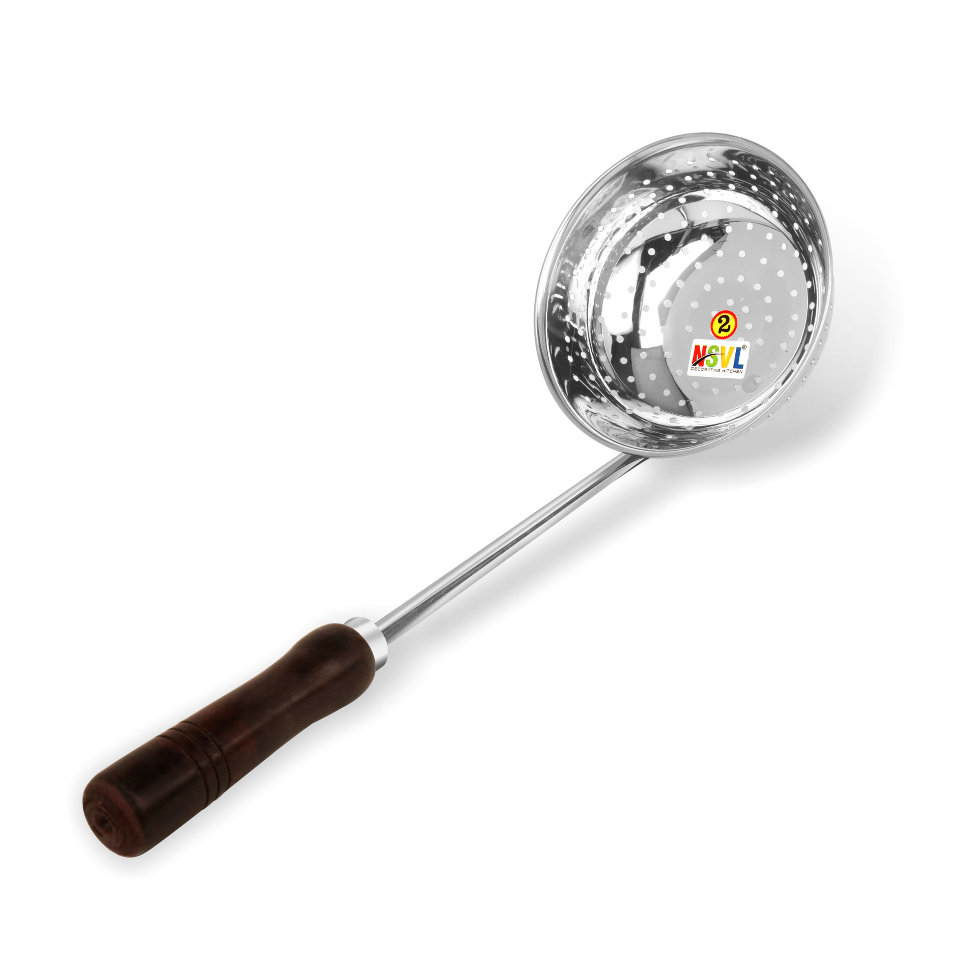 NSVL Stainless Steel Poha Jhara / Poha Strainer , Steel Food Strainer , Boondi strainer Silver (Exclusive Black Handle)