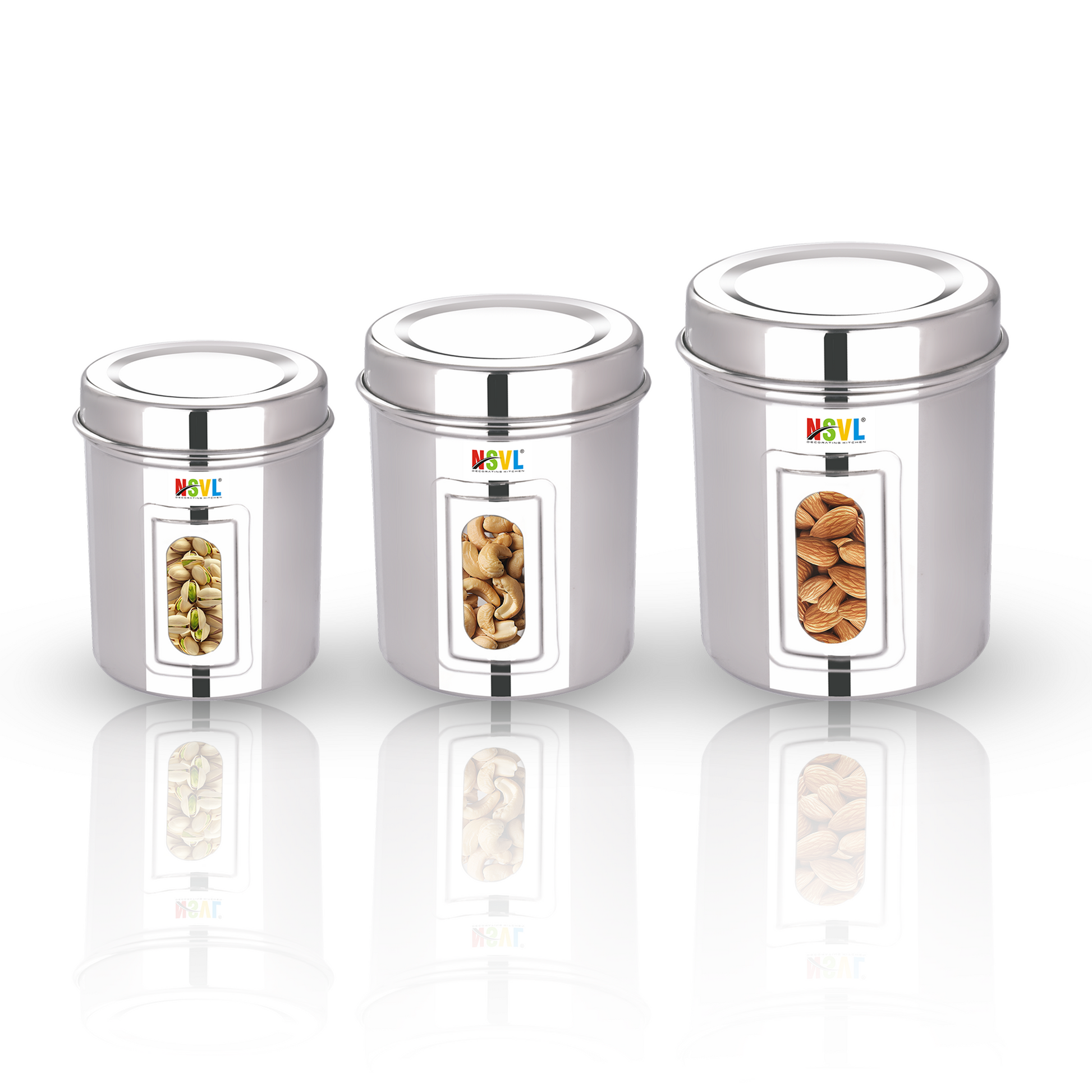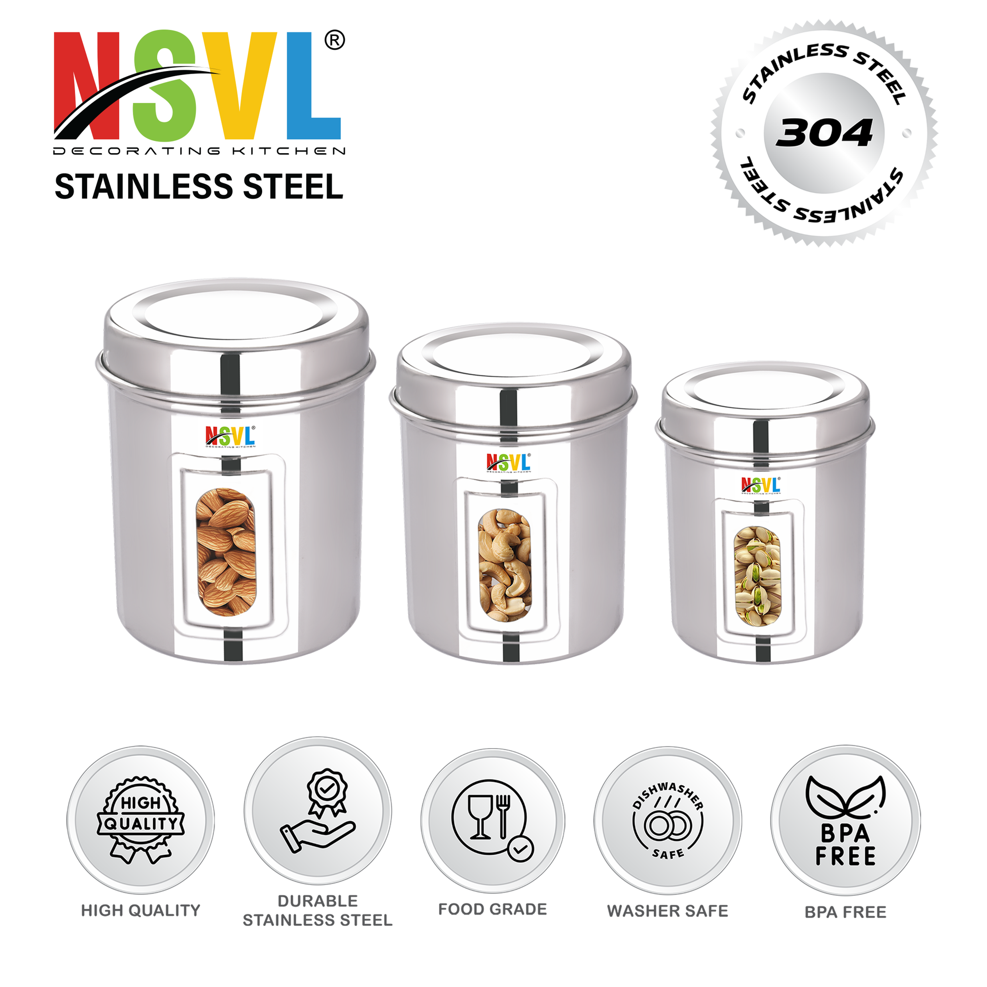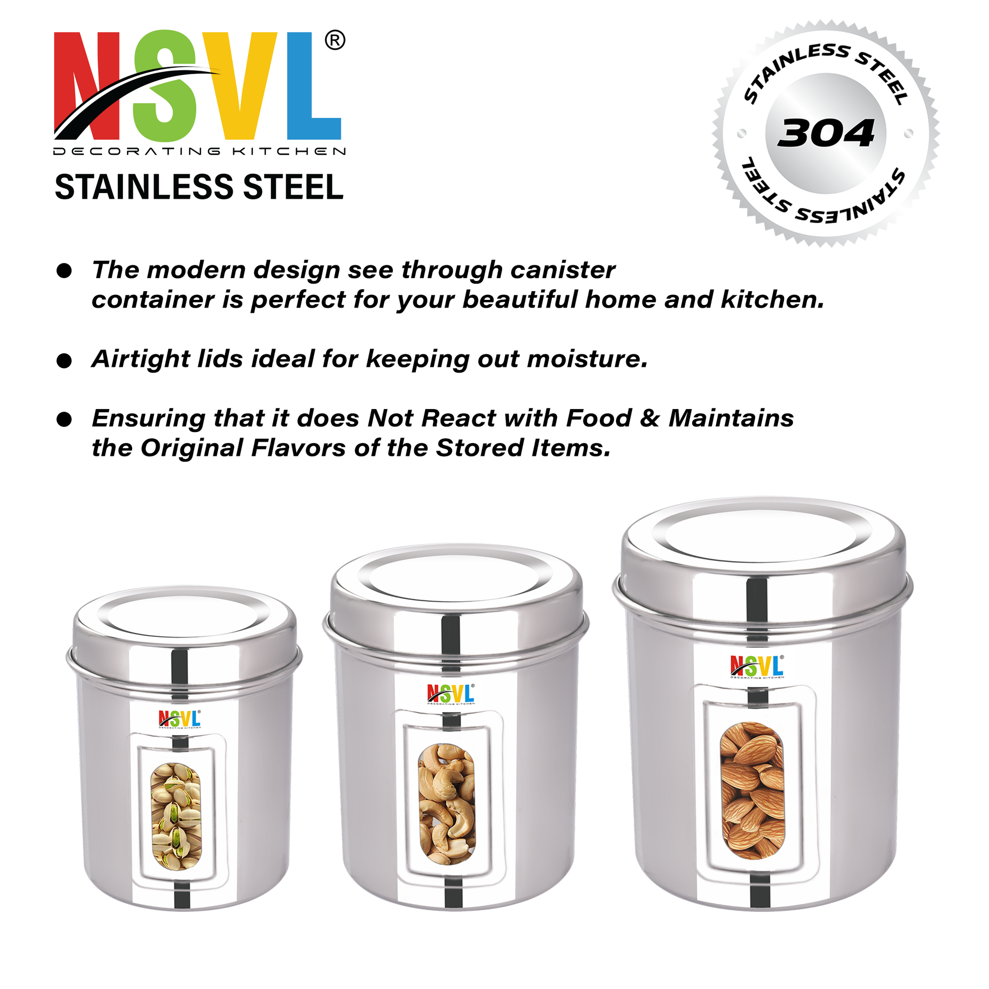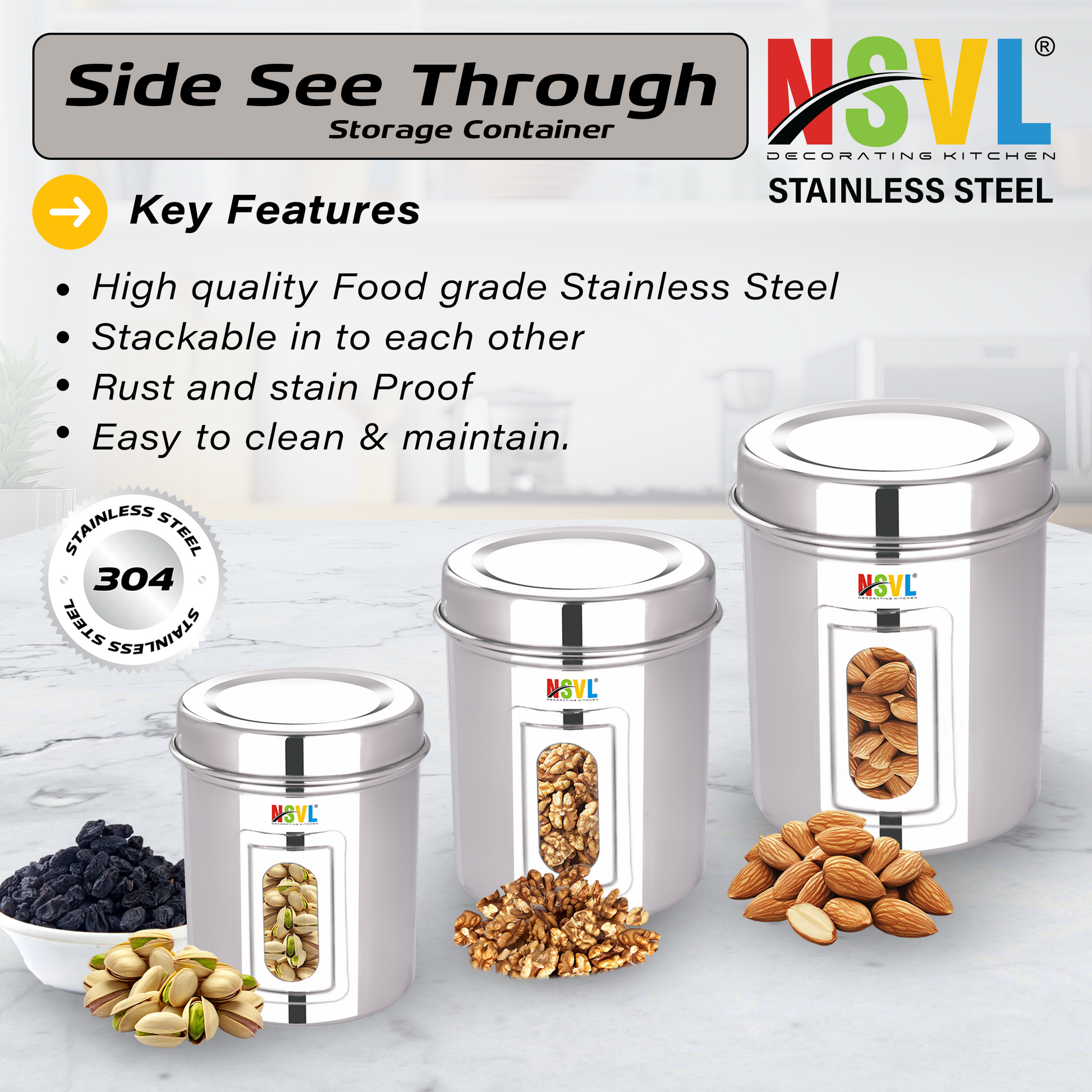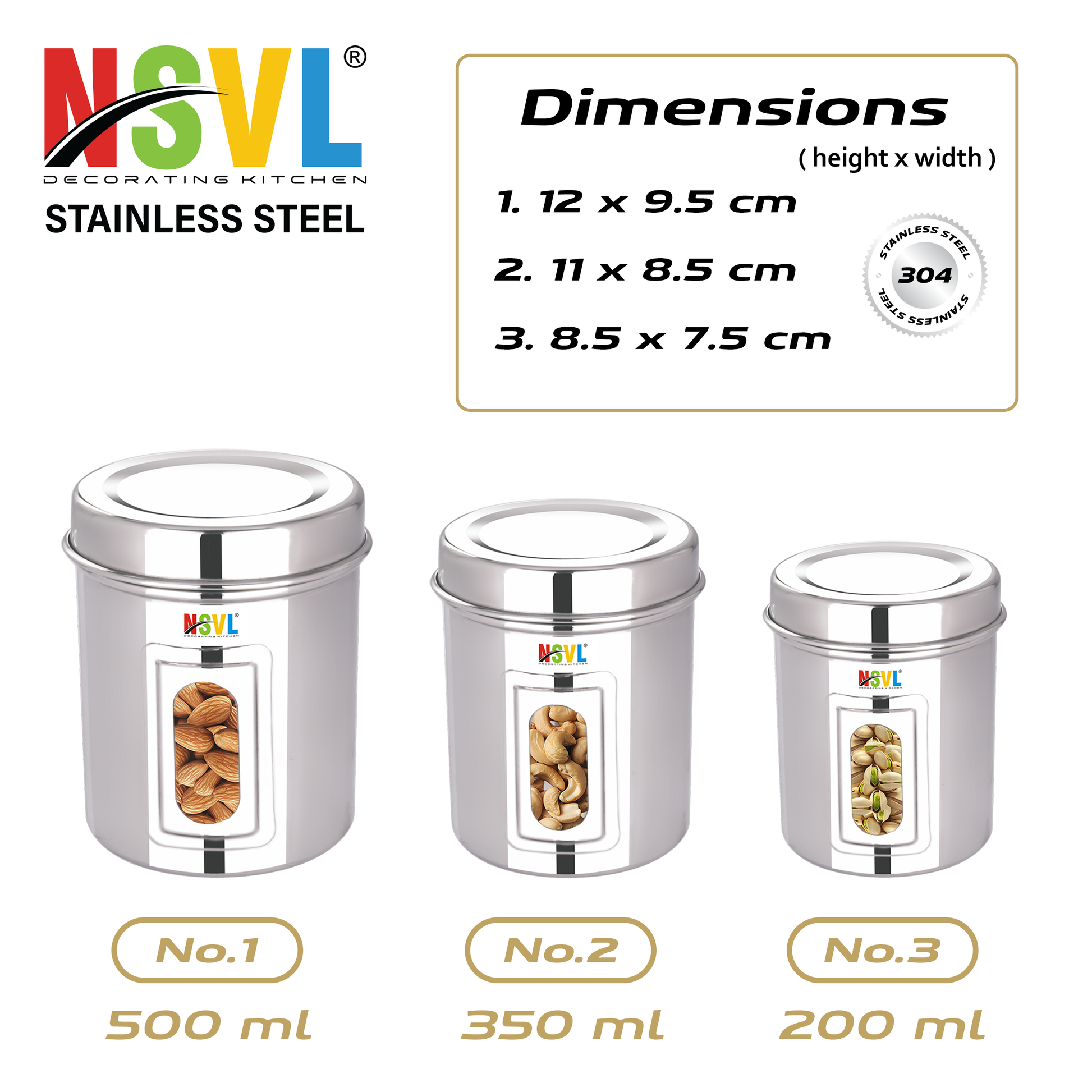 NSVL Stainless Steel Side See Through Dabba | 3 Size Of Dabba 500ml , 350ml , 200ml |Storage Container | Kitchen Container | Silver Colour Pack of 3