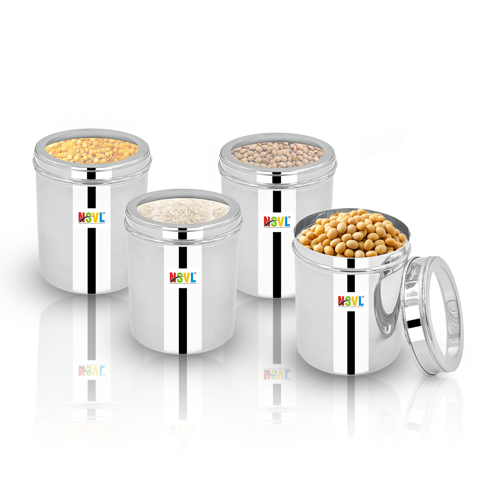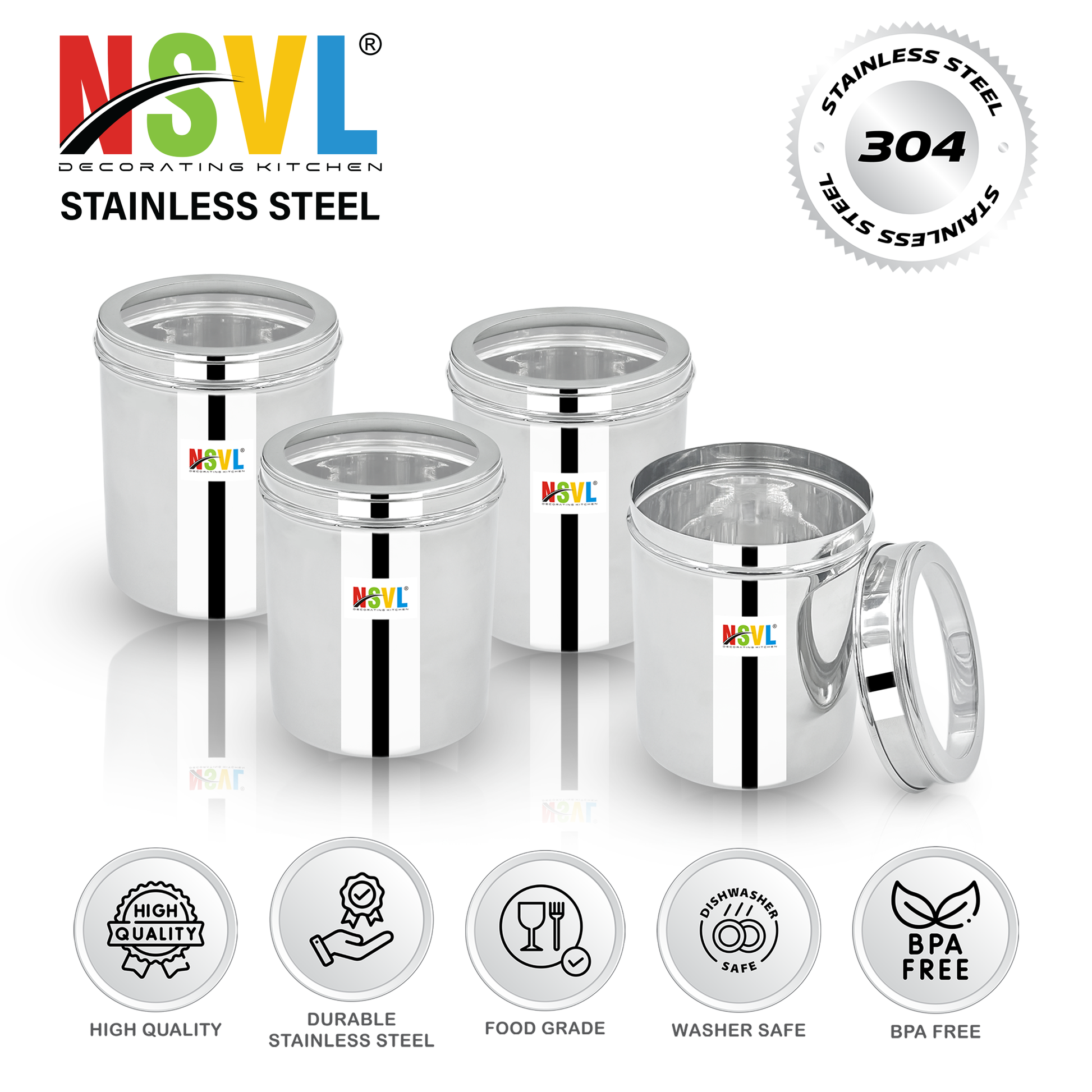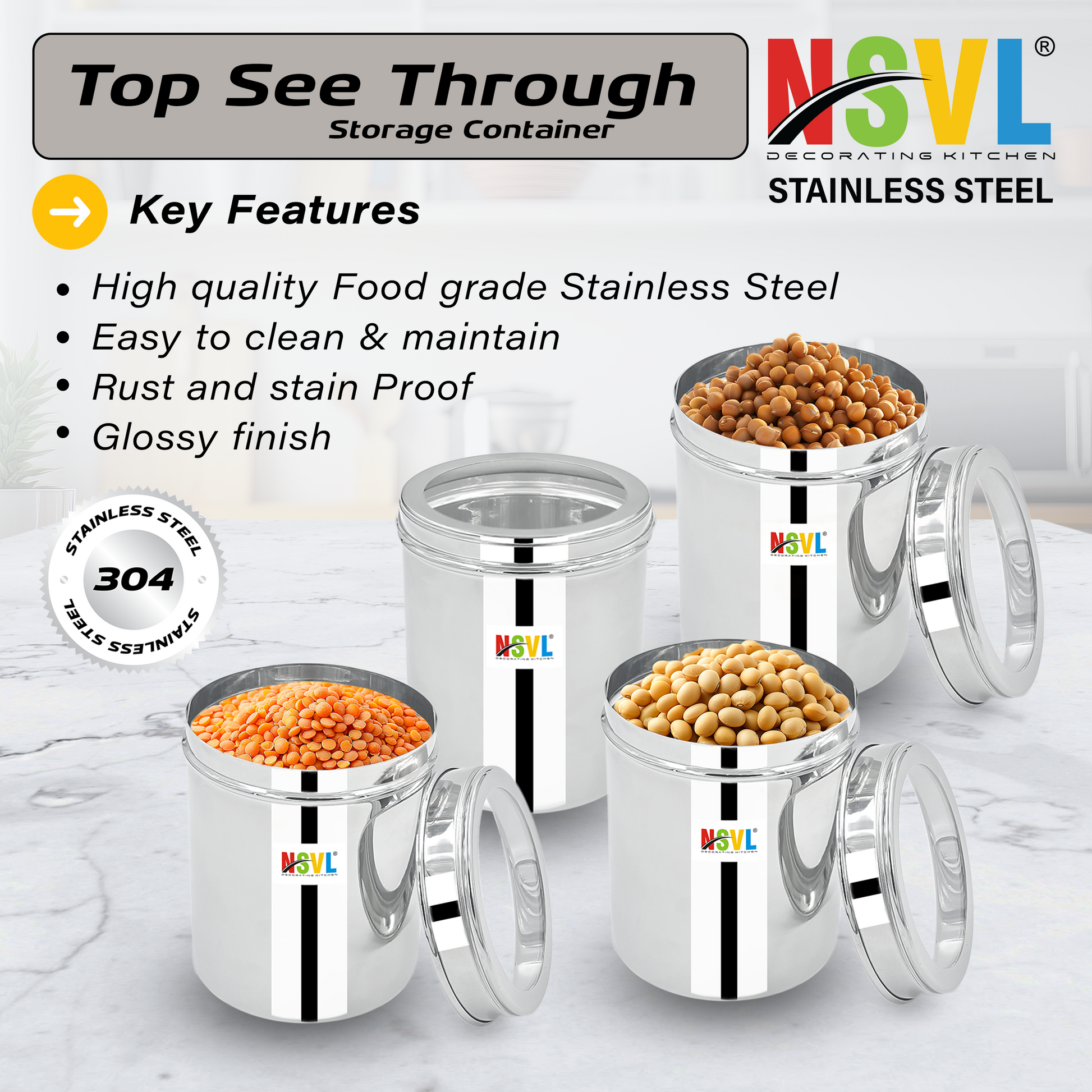 NSVL Stainless Steel Top See Through Containers for Kitchen | Mirror Polished Stainless Steel Containers With Lid and Transparent Window | Multipurpose Dabba Set for Kitchen | Pack of 4