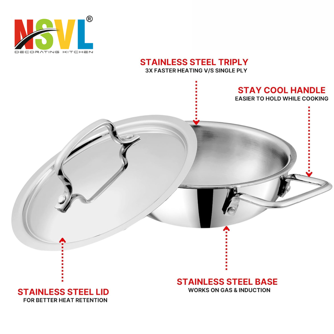 NSVL Triply Stainless Steel Cookware Kadai With Lid - 2.5 mm Thick Extra Deep Kadhai/Kadai for Cooking/Induction Bottom, Gas Base