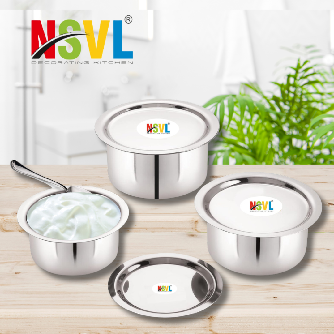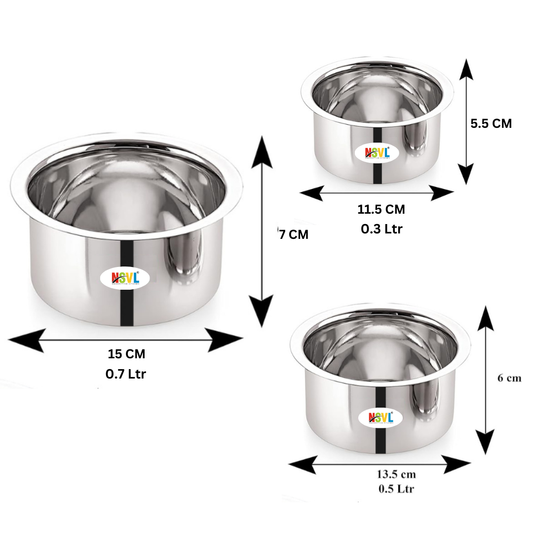 Elevate your kitchen storage with this sleek and durable stainless steel flat tope set of 3 pieces. Crafted from high-quality stainless steel, these topes are designed to withstand the rigours of daily use while maintaining their lustrous appearance. The set includes three topes of varying capacities - 300 ml (approximately 10 fl oz), 500 ml (approximately 17 fl oz), and 1 litre (approximately 34 fl oz), catering to your diverse storage needs. Whether you need to store dry ingredients, leftovers, or freshly cooked meals, these topes offer an airtight seal to keep your food fresh and flavourful. The flat design not only saves precious cabinet space but also allows for easy stacking, making them a practical choice for compact kitchens. With their sleek and minimalist aesthetic, these stainless steel topes seamlessly complement any kitchen decor. Upgrade your storage game with this versatile and long-lasting tope set.